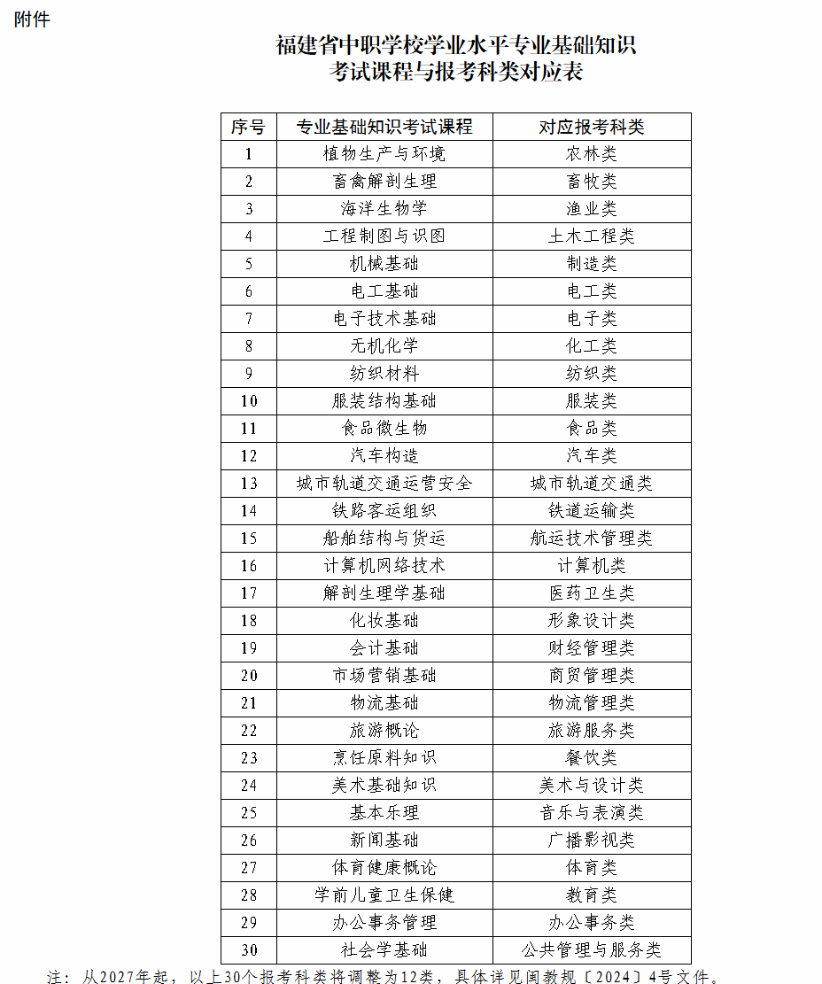 从2027年起,报考科类将从现有30类调整为12类,具体详见《福建省教育厅关于调整福建省高职院校分类考试招生(面向中职学校毕业生)实施办法的通知》(闽教规〔2024〕4号)。